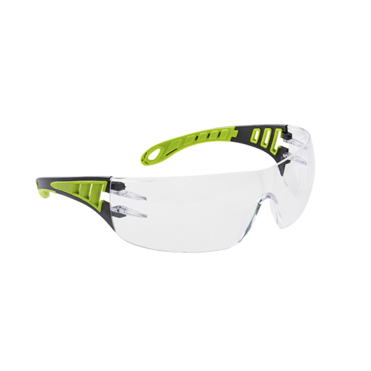 The Portwest PS12 Tech Look Clear Spectacles are lightweight safety spectacles designed for dielectric safety, featuring metal free hinges for enhanced protection.