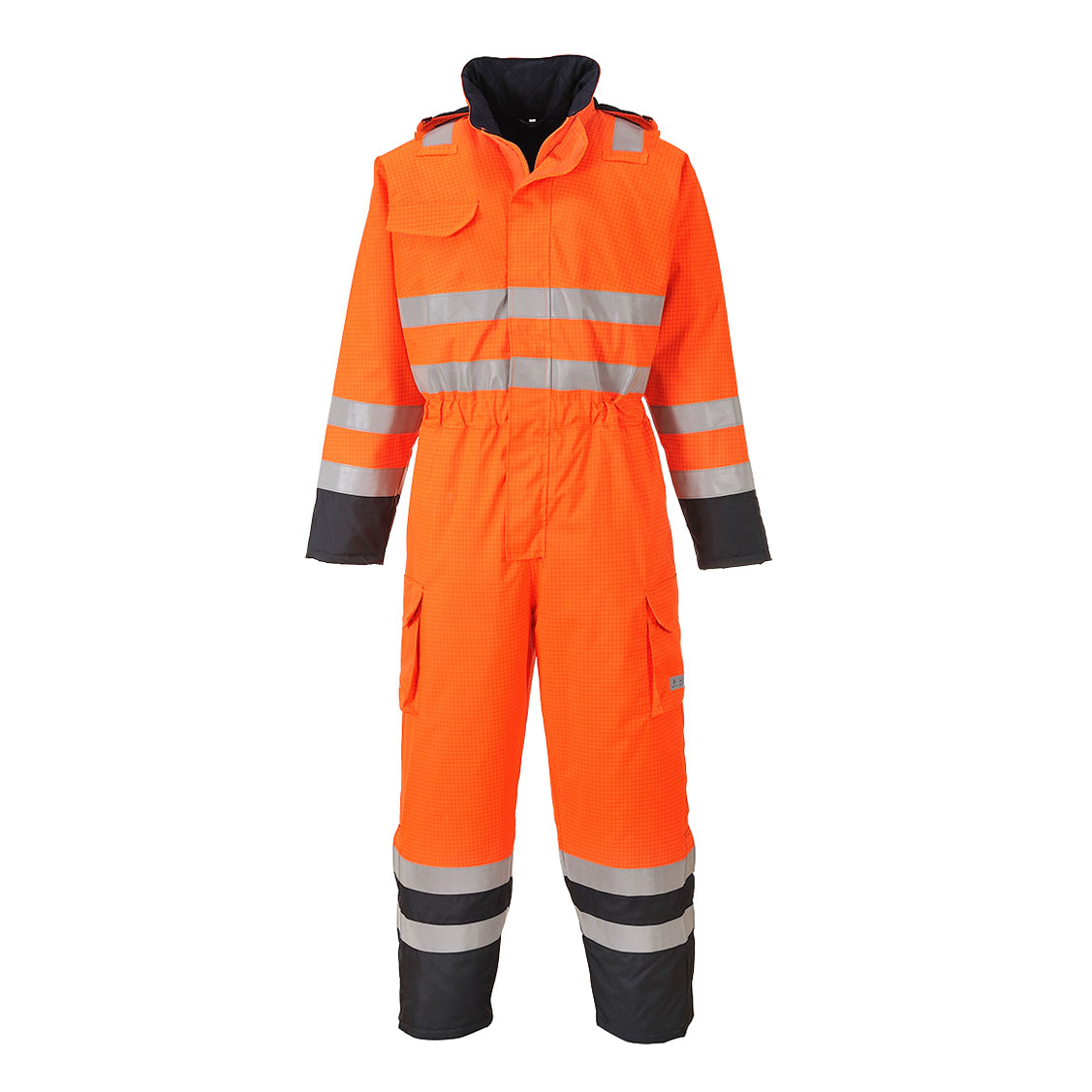 This antistatic coverall is constructed from a flame resistant and waterproof fabric which is finished with a PU coating so that water and dirt are effectively repelled from the surface.
