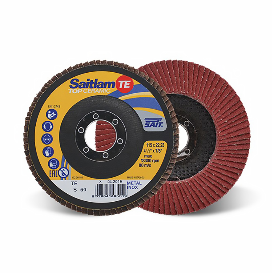 The Sait 048504 Ceramic Abrasive Flap Disc is part of the SAITLAM-TE family and features high quality ceramic aluminium oxide cloth with a glass fibre backing.