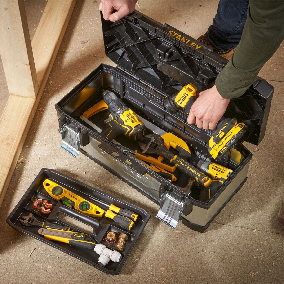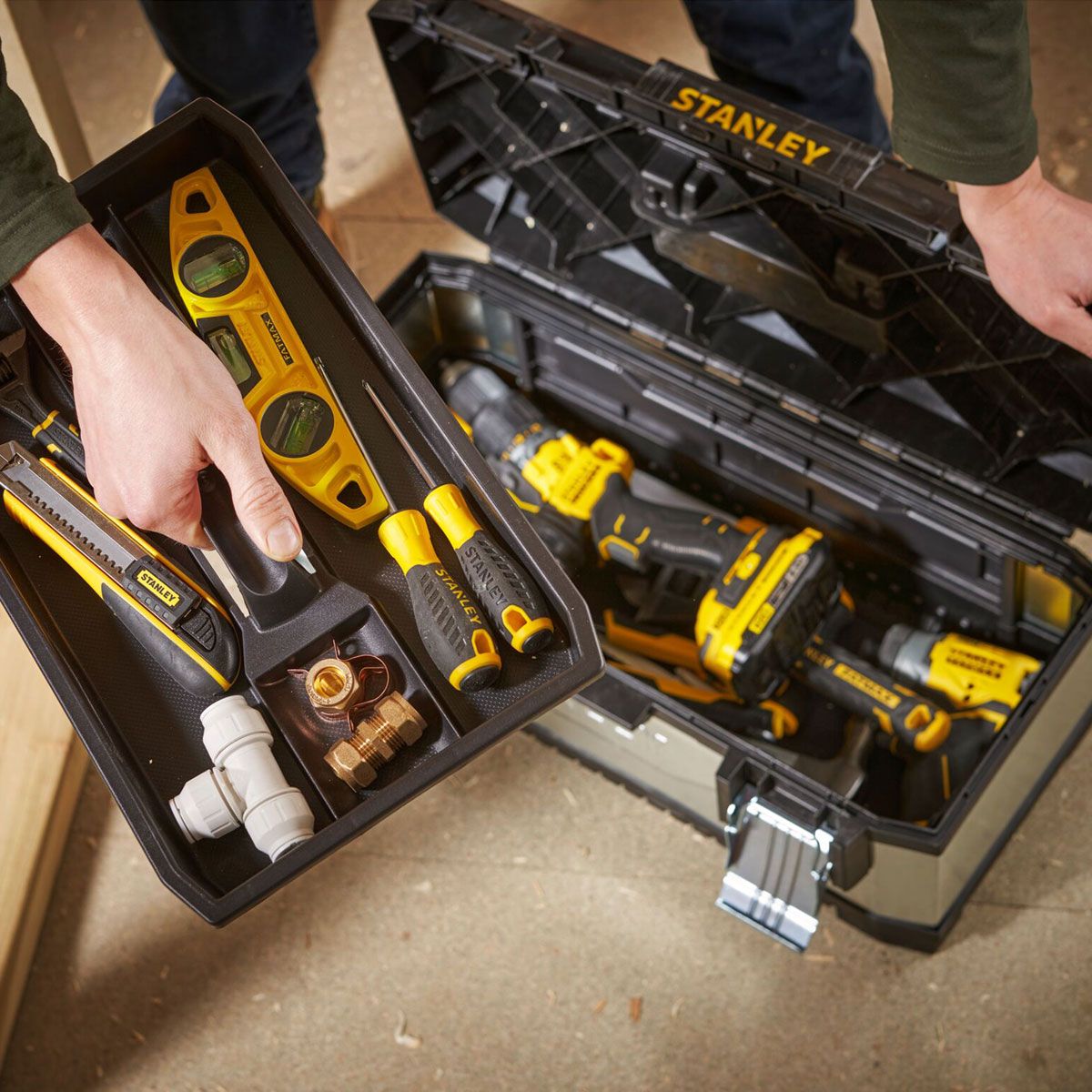The Stanley 1-95-620 Galvanised Metal Plastic Toolbox 26" is the ideal storage solution for hand tools, small power tools and accessories.